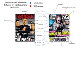 The document summarizes how the media product uses and develops conventions of real media. It discusses using conventions like anchoring the main image and headline, using a large masthead, medium shot for the main image, direct address from models, and representing females. It challenges some conventions by not sexually objectifying women and representing "psychofemme" females. The cover, contents page, and double page spread all use conventions like color schemes, mastheads, coverlines, page numbers, and rule of thirds layout. Some conventions are challenged like not using borders for images. Overall, the media product draws from real conventions while putting its own spin to appeal to its target audience.