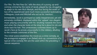 This document analyzes how the film "Do Not Pass Go" uses conventions of real crime comedy films. It describes the opening scene where the main character Jacob unsuccessfully attempts to rob a store in an overly confident manner. This establishes the film's genre as a crime comedy. The credits are shown in bright colors similar to other comedy films. Slapstick comedy is used, such as when Jacob gets hit by a door and gets a nosebleed, resembling scenes from films like "The Naked Gun". Props like money and knives shown on a table also signal that the film is of the crime genre.
