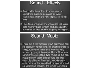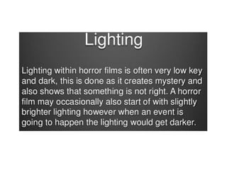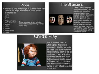 The document discusses how the film uses and challenges horror film conventions in its opening. It conforms to conventions through using an isolated derelict location, intense music, rope and tape as props to show the character being tied up. However, it also challenges conventions by showing a warm cosy house at first, everyday props like a phone and toothbrush, and normal clothing. The film title "Delusion" and production company logo fittingly conform to horror conventions while balancing challenging conventions makes the opening successful at being both unique and clearly a horror film.