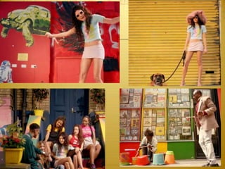 The document discusses music video conventions and theories. It explains how the group's music video used repetition of base tracks and a bright color scheme throughout, following Goodwin's theory that music videos should have a narrative storyline. Vernallis' theory that music video editing should be broken up to draw attention is demonstrated through the example of the Rizzle Kicks "Lost Generation" video. The document concludes by explaining how the group's video targeted a teenage audience with its bright colors, outfits and settings shown in sample shots, drawing on theories from Goodwin and Vernallis.