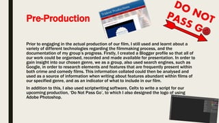 George learned about various technologies used during the filmmaking process. He created a Blogger profile to organize and document the group's work. He researched crime and comedy films using Google to inform the writing of their film. During production, the group used a Panasonic HD camera for high quality video and a voice recorder for clear audio. They edited the film using Adobe Premiere Pro, which allowed for easy editing and smooth transitions. After filming, they uploaded the video to YouTube and used PowerPoint, Word, and their blog on SlideShare to document and describe the filmmaking process.