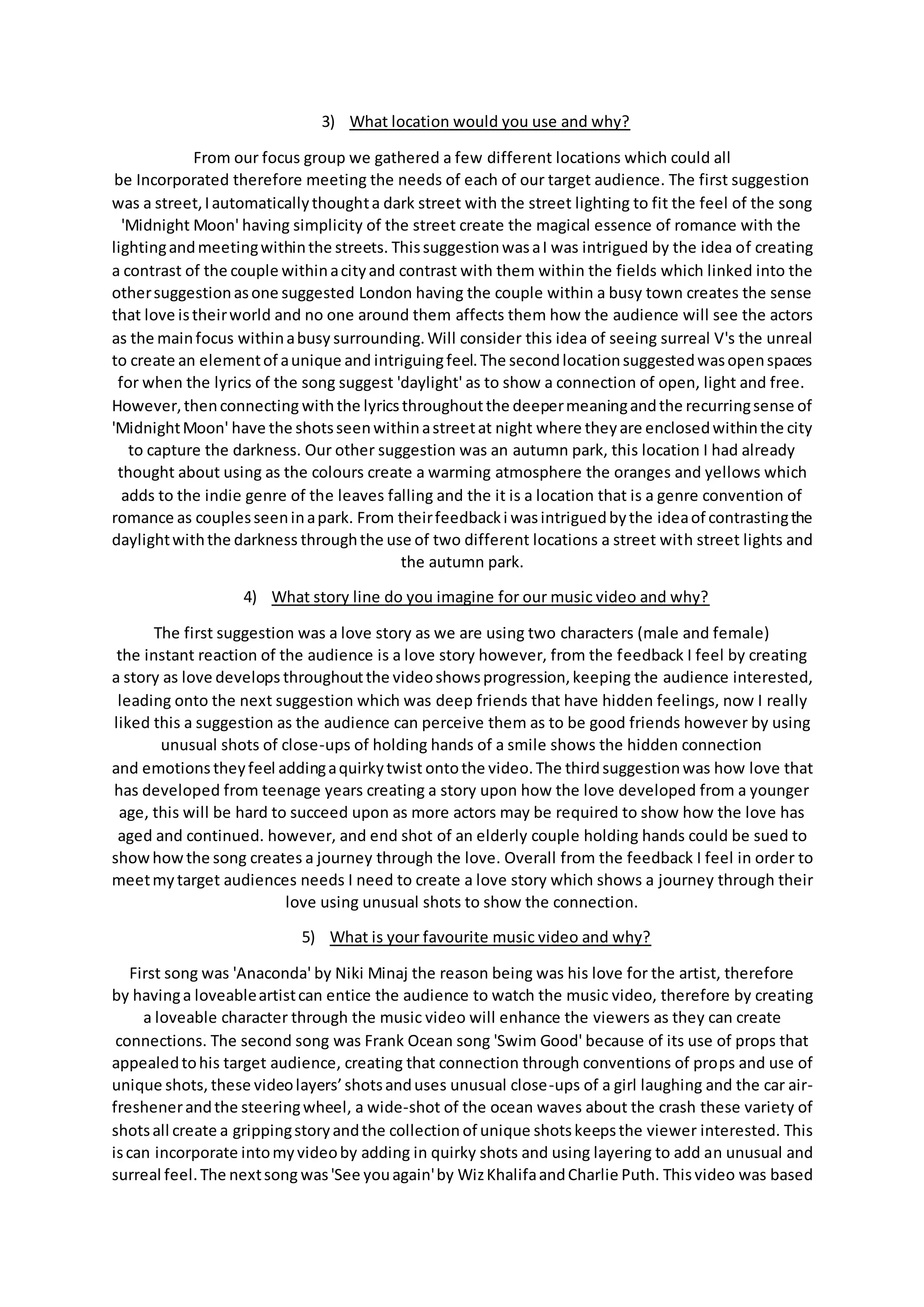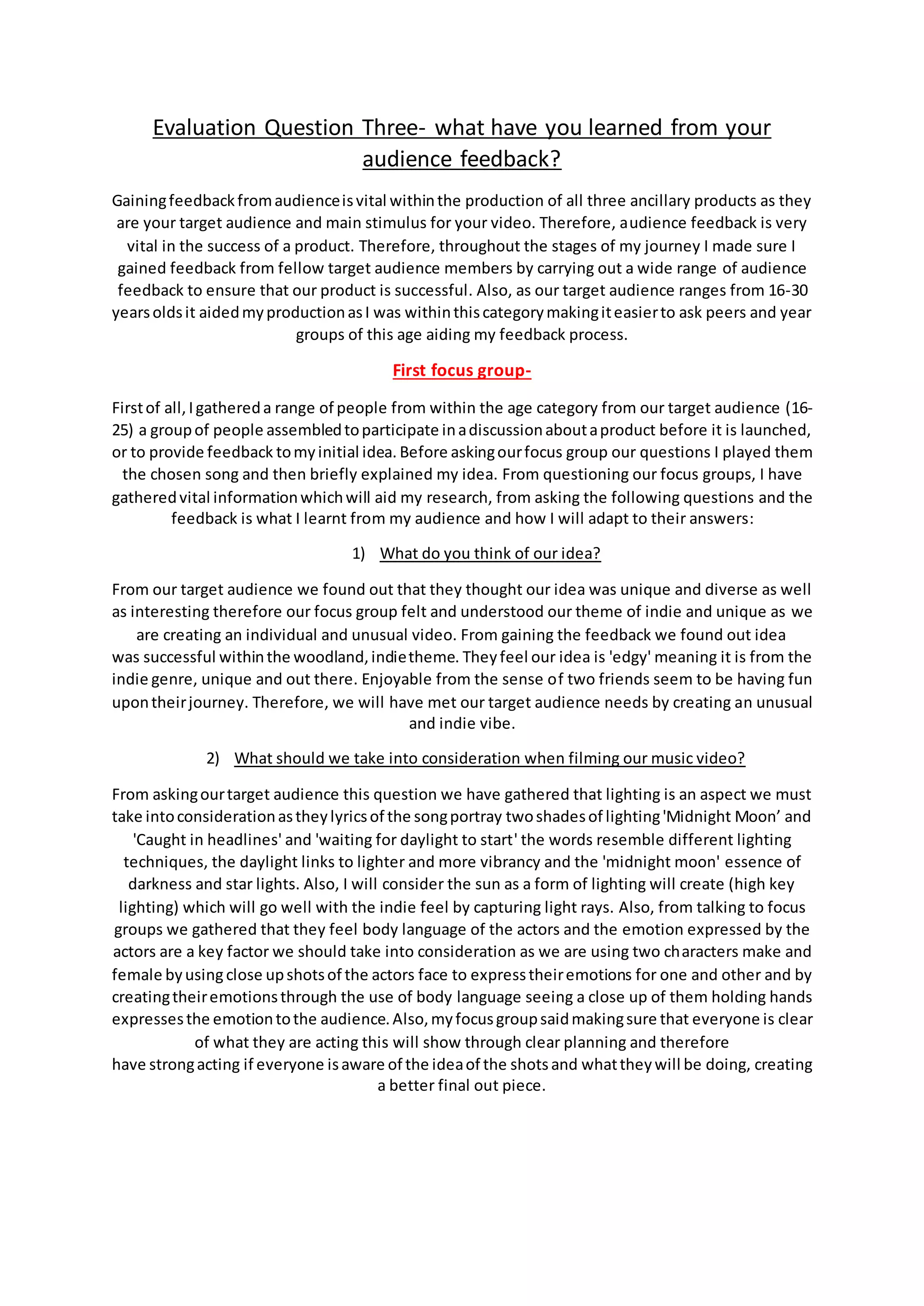 The document provides feedback from various focus groups and questionnaires conducted by the creator of a music video to help improve their project. They learned that their idea was unique and interesting to their target audience. Feedback indicated they should consider lighting, body language, storytelling, and location when filming. The creator incorporated suggestions about using contrasting locations and shots to convey different tones. Overall, receiving audience feedback at various stages helped the creator better understand what their target viewers wanted and allowed them to make beneficial changes to their music video.