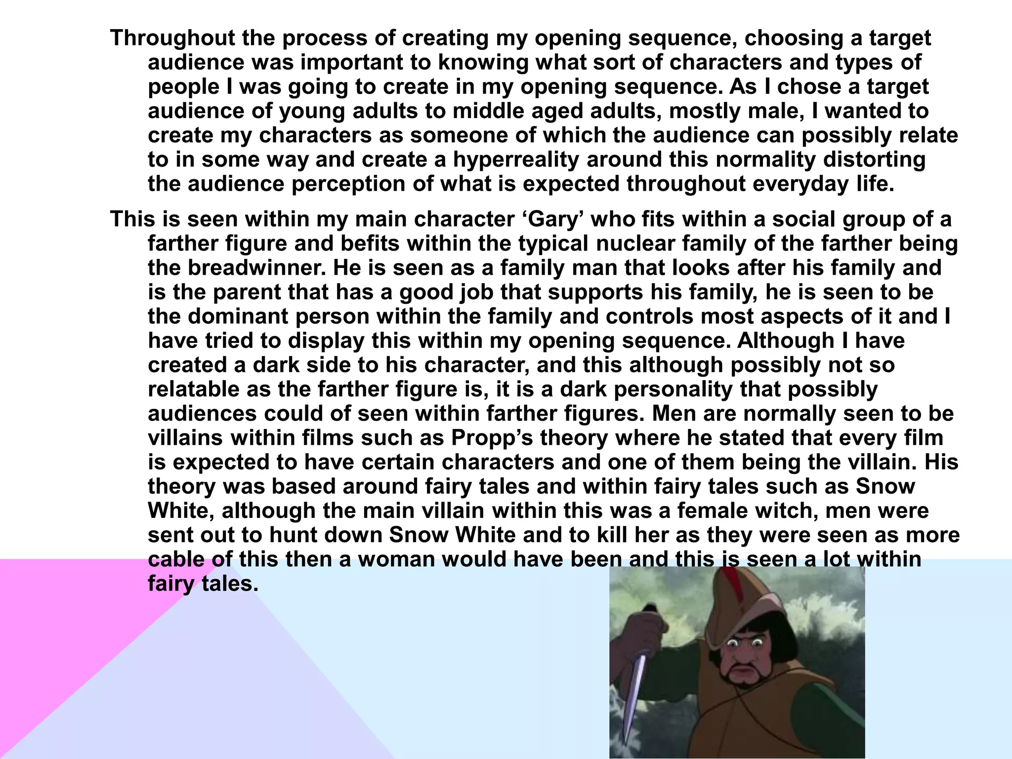 The document discusses the main character, Gary, featured in the opening sequence. Gary fits into the social group of a family man and father figure. He is portrayed as the dominant person in the nuclear family who works and provides for his wife and children. However, the character also has a dark and psychopathic side. While Gary follows some stereotypes as the male villain, he also subverts expectations by being a family man rather than a typical thriller villain. The representation of Gary as both good and bad challenges audience perceptions of characters and their Binary Opposites theory that people can only be understood as purely good or bad.