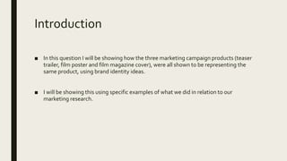 Frank Hammond evaluates the brand identity of the marketing campaign for a film called "The Girl in Red" which included a teaser trailer, film poster, and film magazine cover. The marketing campaign successfully established a consistent brand identity across materials by using the color red, a romantic yet sleek font, and portrayals of the main characters that matched their personalities. This allowed the different elements to clearly represent the same film and appeal to the target audience of 15-25 year olds of both genders.