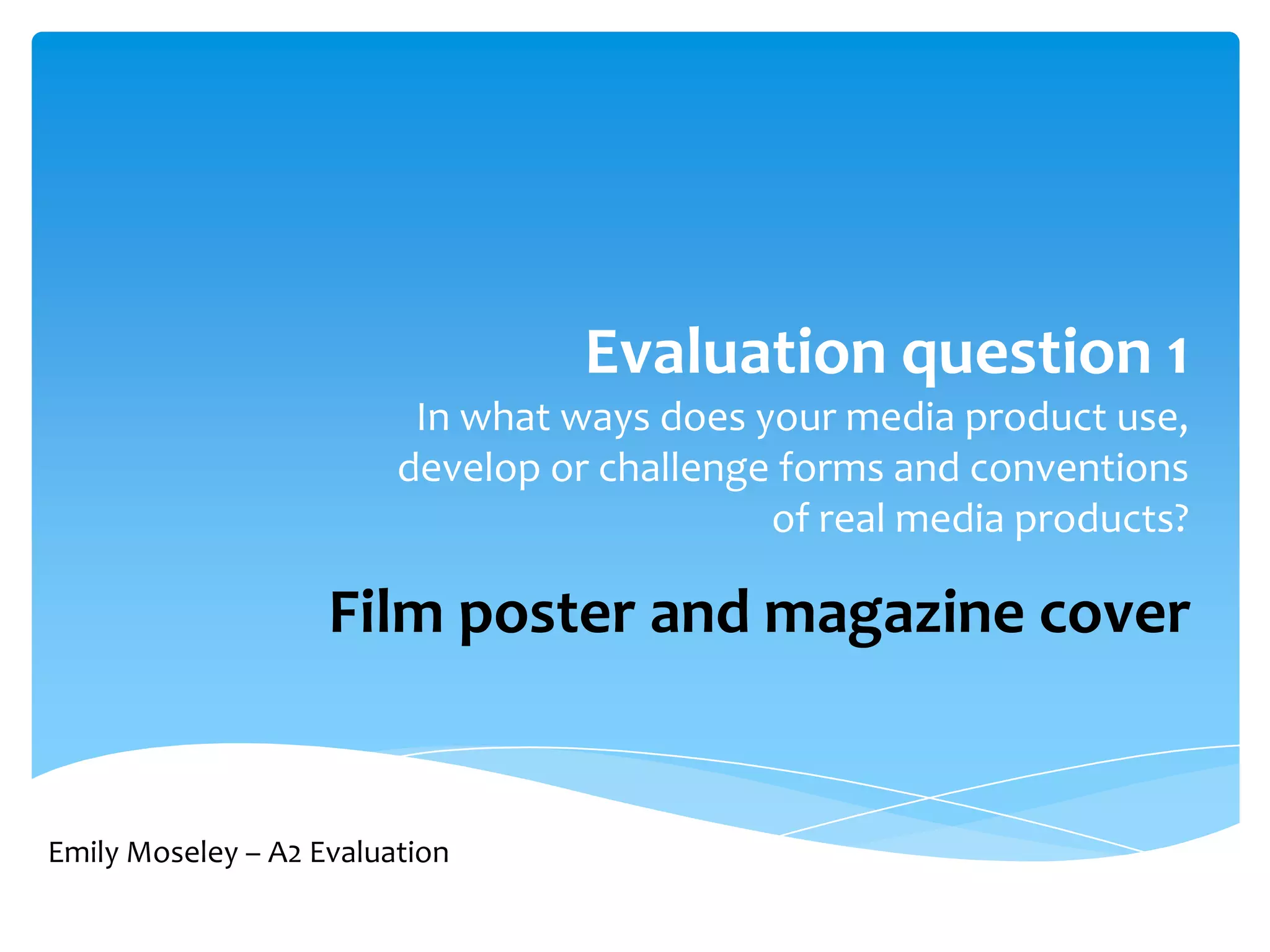 1) The film poster and magazine cover created by the student follow many conventions of real media products in their genres. Both utilize a limited color palette, minimal fonts, and emphasize key information like the title and credits.