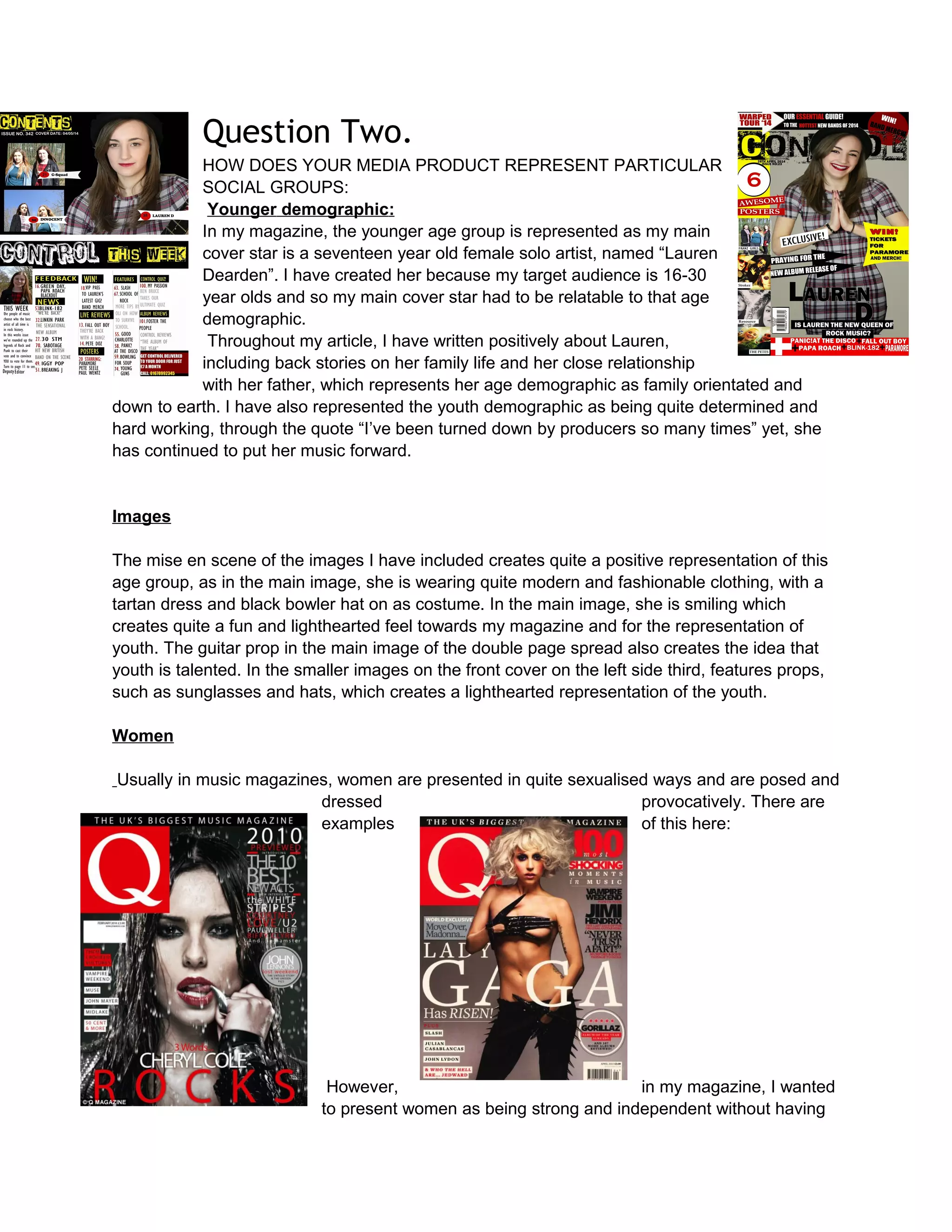 Women are typically presented in sexualized ways in music magazines but here are shown as strong and independent without needing sexual gratification. The main cover star wears covered but feminine clothing along with some masculine accessories like a man's hat and chunky boots to challenge gender stereotypes.