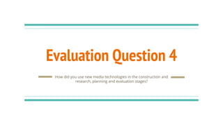 The document describes the various new media technologies used by the author during the research, planning, and evaluation stages of a project. It discusses how Google Docs, Slides, and search were used for collaboration and research. YouTube was used to watch film trailers and marketing videos. Prezi was used to create a visual presentation on genre conventions. Pearl & Dean's website provided information on film audiences. Pinterest and FreeSound.org were used for costume and sound research, respectively.