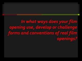 The document discusses how a student film opening uses conventions of horror film openings. It examines five conventions used: 1) a secluded location to make characters vulnerable; 2) mis-en-scene elements like fake blood and tools to imply danger; 3) ominous sounds to build tension; 4) a fake scare to startle the audience; and 5) implying planned killing rather than showing it to intrigue viewers. The opening challenges conventions by changing the timing of death while effectively using researched conventions to create a pleasing horror film introduction.