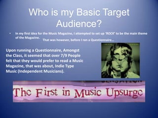 The document discusses determining the target audience for a music magazine project. A questionnaire found that most respondents preferred a magazine focused on independent music. This suggests the target audience will be those interested in independent artists. The document considers whether to aim the magazine at both genders aged 18-21, or just teenage females. It's important to avoid making the magazine too "girly" or focused on gossip. The target audience for an independent music magazine is likely to be rebellious and want something different from mainstream magazines. The cover design aims to attract this audience with its unique feline face design, twisting title, and varied colors intended to catch the eyes of a young audience seeking new music.