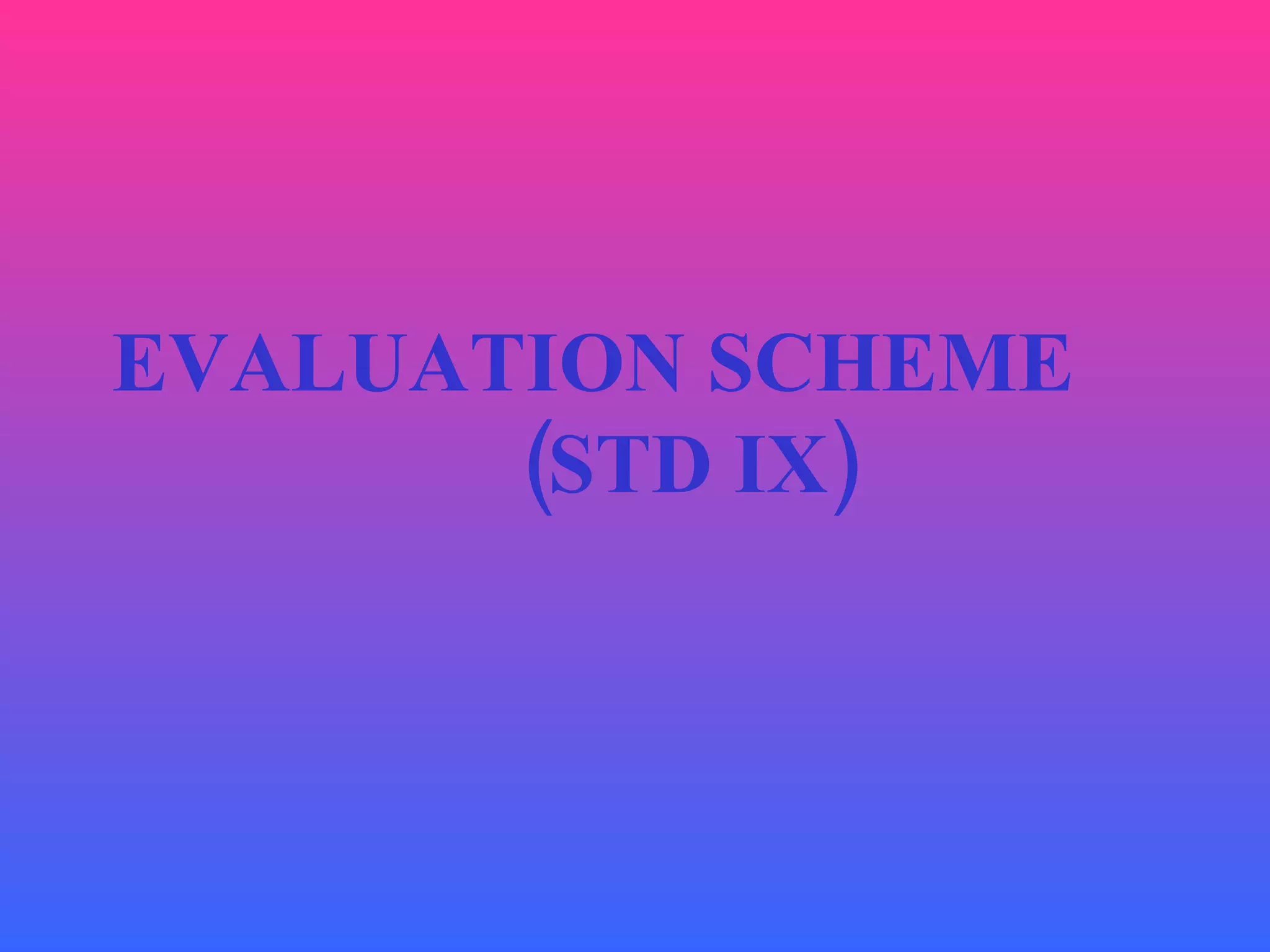 The document outlines an evaluation scheme for 9th standard students. It describes the marking structure for various subjects like languages, mathematics, science, social science, and other graded subjects. The key points are: