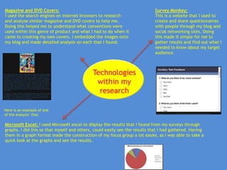 The student used various media technologies at each stage of their project. During research, they used search engines, YouTube, blogs, and Survey Monkey to analyze examples and gather audience feedback. Microsoft Excel was used to display survey results graphically. During planning, storyboards were created in Microsoft Word and draft designs were made in Paint. A tripod, video camera, and Apple MacBook were used for filming and editing in iMovie. Fonts were found on Dafont for ancillary tasks. Presentation of the evaluation was done in PowerPoint and Prezi to make it less text-heavy. Survey Monkey again collected audience feedback on the final product.