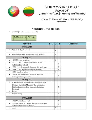 Students from Portugal visited Lithuania from May 7th to 15th as part of a generational link and learning exchange program. The schedule was packed with cultural activities including concerts, sports, excursions around the region, visiting museums and historic sites, participating in traditional events, and spending time with host families. Based on the detailed itinerary, the students experienced many aspects of Lithuanian culture, history, and way of life during their week-long visit.