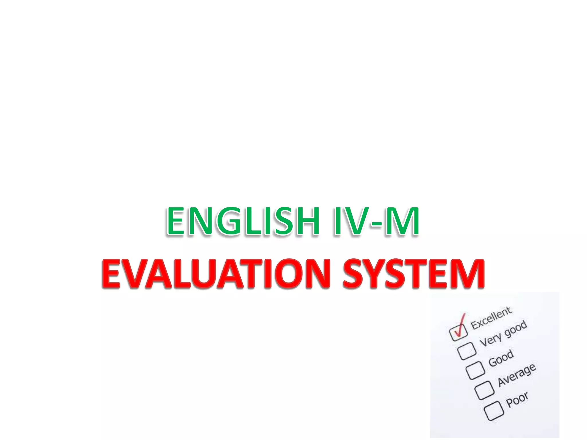 English IV-M students will be evaluated through unit quizzes, midterm exams, and assessments of speaking, writing, and listening skills. Unit quizzes on Blackboard are each worth 3% of the semester grade. The first two midterm exams on Blackboard cover material from unit quizzes and are each worth 10% of the semester grade, while the final exam is worth 14%. Speaking, writing, and listening skills will each be evaluated once during midterm weeks and again in the final two weeks of the semester.