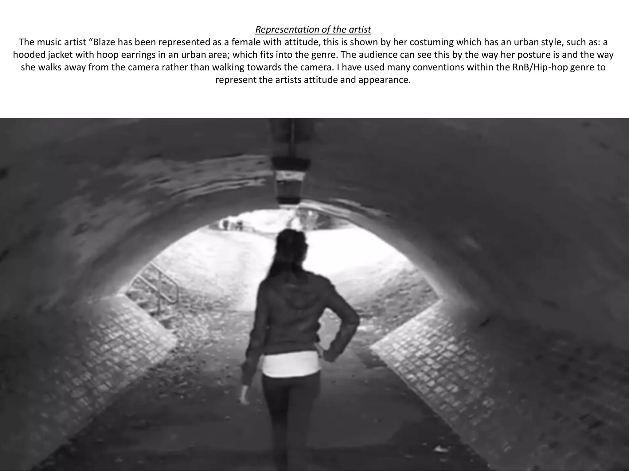 The document summarizes the representation of an artist in a music video through various elements of filmmaking. It describes the costuming as urban style to fit the R&B/hip-hop genre. It notes that the location is the subway and artist's house, and the black and white filming creates a darker atmosphere. It discusses the camerawork, performances, narrative, and how different shots and props are used to convey meaning and suggest the genre.
