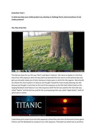 The title sequence for the film "Don't Look Back in Sadness" introduces the main character Sam and his lost love Emily through flashbacks. It shows Sam's memories of them as children and teenagers under a significant tree, and contrasts this with his present-day sadness alone at the tree after apparently losing Emily. The sequence establishes the romantic drama genre and foreshadows Sam struggling to move on from loss. It introduces the characters through minimal dialogue and uses fades between flashbacks to convey the passage of time.