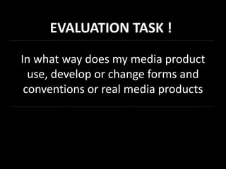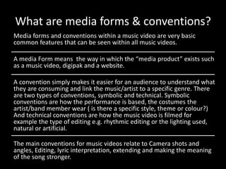 The document discusses conventions used in music videos. It provides examples from the author's own music video for an artist named Alec. Some conventions discussed and used include close-up shots to emphasize emotion, long shots to establish location, rhythmic editing to match the song, costume and prop changes to show the artist's progression, and natural lighting and locations to portray the artist as down-to-earth. Inspiration was drawn from artists like Ed Sheeran and Passenger who began as buskers and grew in success. The locations and lighting were chosen to fit the narrative of Alec as a new, hardworking artist striving to make it in the industry.