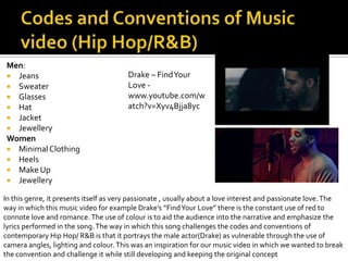 This document discusses how the media product challenges conventions of real media products like music videos. It uses forms such as passionate lyrics about love, use of the color red, and portraying the male as vulnerable. It aims to break conventions like overly sexual portrayals of women and unrealistic representations of men. Shots are carefully edited to match lyrics, beats, and emphasize themes like lost love. Overall, it strives to develop genre conventions while also challenging stereotypes through more balanced gender representations and a focus on the narrative over provocative displays.