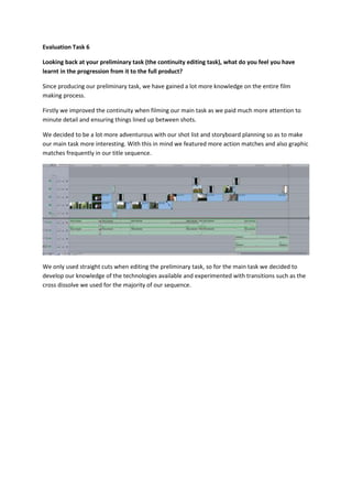The document discusses how the filmmakers improved from their preliminary task to the full film production. They paid closer attention to continuity details between shots. They also planned more adventurous shots and included more action and graphic matches in the title sequence. The filmmakers experimented with transitions like cross dissolves instead of just straight cuts. They also learned how to properly record and edit sound and music. They gained experience using technologies like Livetype for titles. Overall, the preliminary task provided a helpful learning experience to improve their skills and knowledge for the full production.