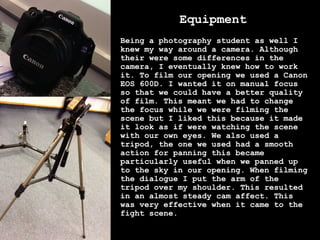 The document details the experiences of a photography student named David Jeffery-Hughes while filming an opening scene using a Canon EOS 600D camera. He learned to utilize manual focus for better quality and employed various techniques, such as using a tripod for smooth panning and overlaying sound from different takes during editing in Premiere Pro. Overall, this experience enhanced his skills in filming and editing, particularly with dialogue and match on action techniques.
