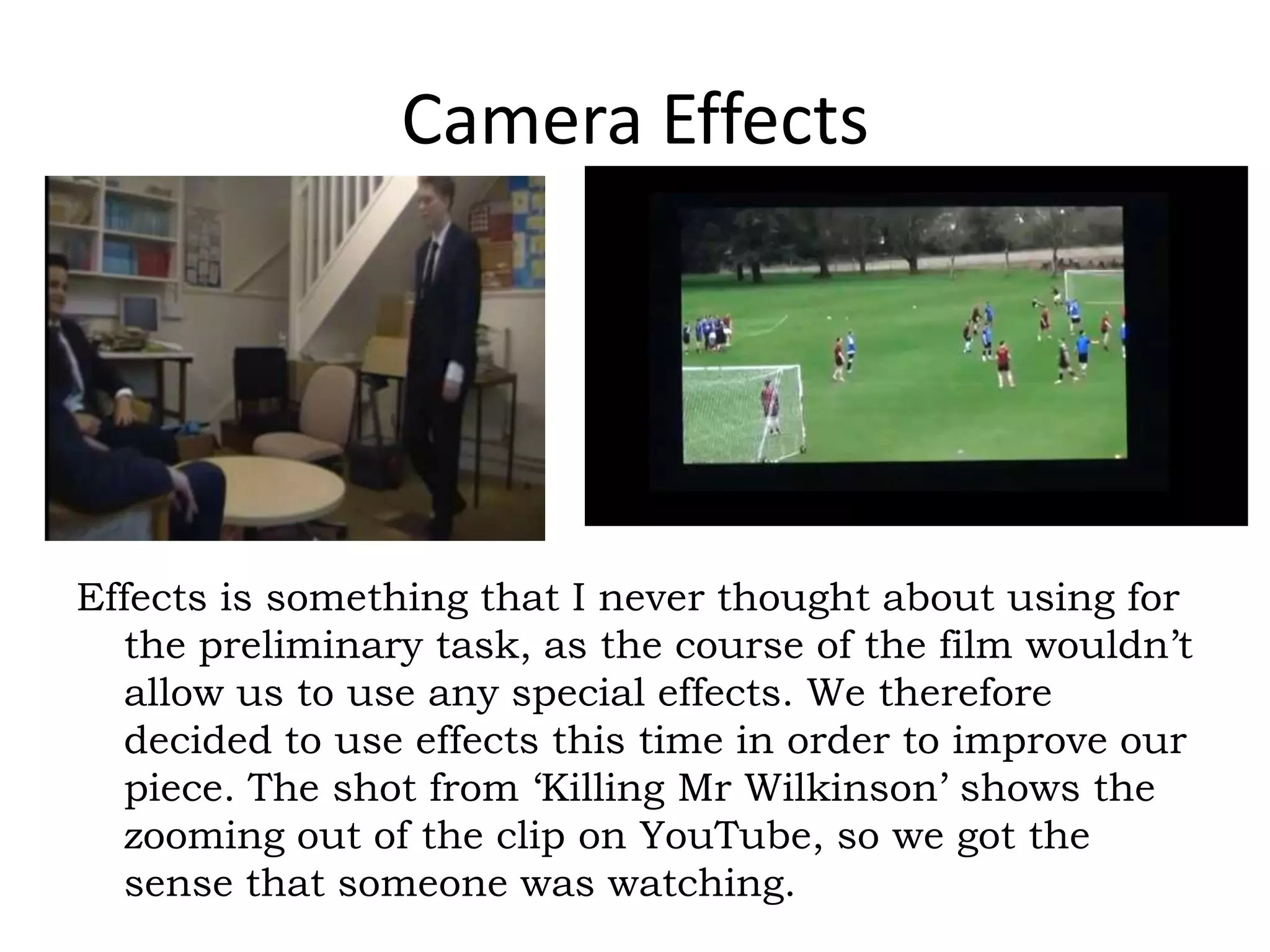 The document discusses improvements made from the preliminary task to the full product. Effects were added, such as zooming out of a YouTube clip, to improve engagement. Background music was necessary for the school advert compared to just using diegetic sound previously. Credits were made more complex, revealing the genre through a computer screen title. Editing improved from faulty continuity to using match on action and a montage then continuity effect for mystery with close ups.