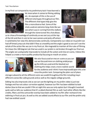 This document summarizes the improvements made from the author's preliminary film task to their final cut. It describes using more diverse shot types, like extreme long shots, that allow for better showing of continuity. The angles are improved to include all of the action. Various rules of filmmaking, like the 180 degree rule, were properly followed. More focus was placed on mise-en-scene elements like clothing, props, and setting to make the world feel more realistic. Editing saw improvements like color correction, filters, credits, and added sound effects to give the film a darker and more polished overall quality.