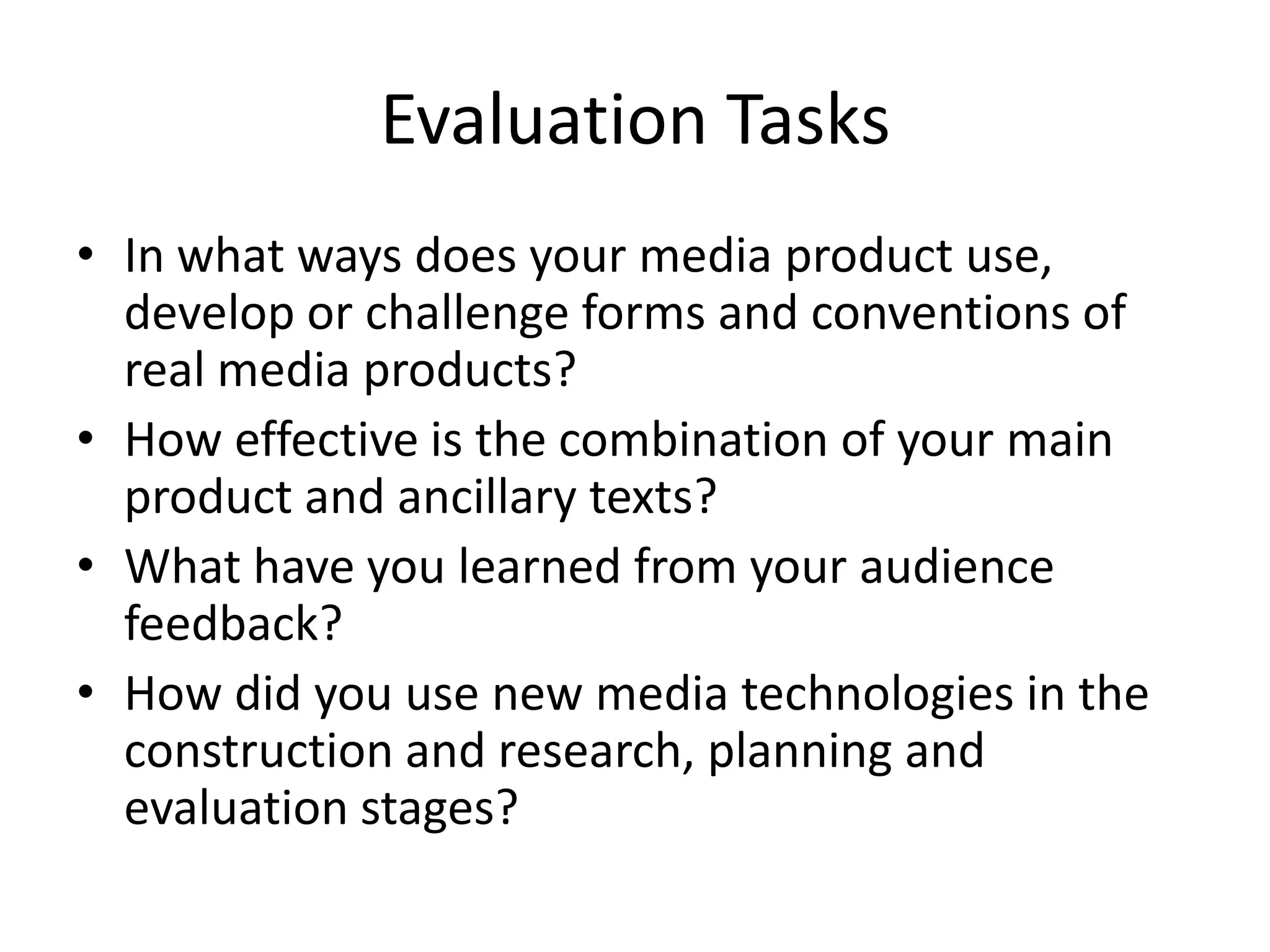 This document outlines four evaluation tasks for a media production project: