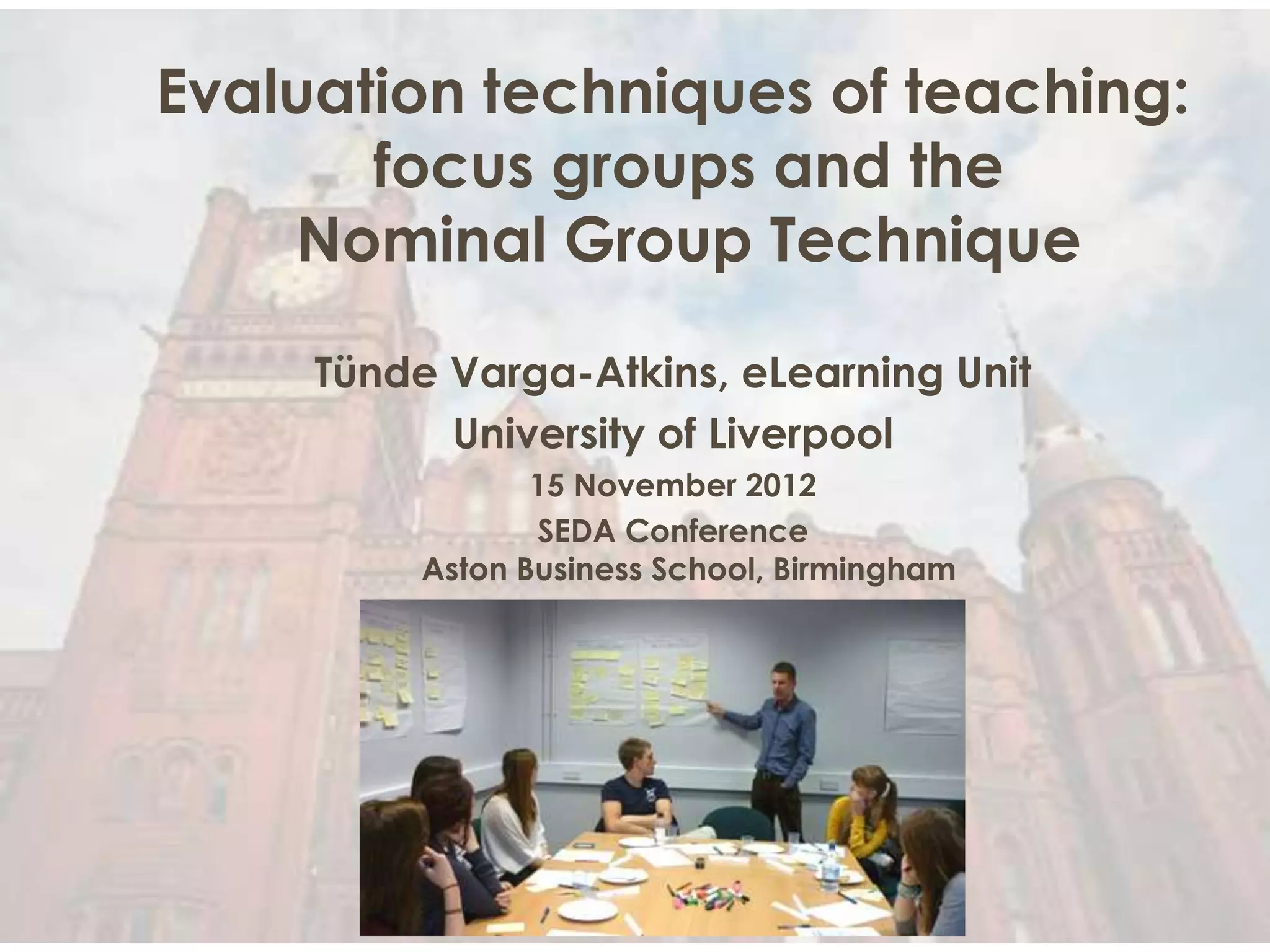 The document discusses evaluation techniques of teaching, particularly focusing on the Nominal Group Technique (NGT) and its combined two-staged approach with focus groups. It highlights the benefits and challenges of NGT and how these methods can improve group decision-making and curriculum development. The document includes insights from educational developers on utilizing these techniques effectively in various contexts.