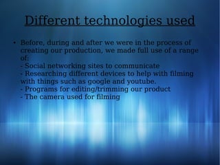 The document discusses the technologies used to create a production project. Social networking sites like Facebook were used to communicate and coordinate filming schedules. Research was done using Google and YouTube to learn about different filming devices. A Canon EOS 600D camera was used for filming due to its image quality and screen. Scenes with low lighting required a Sigma lens for its focusing abilities. Adobe Premier Elements 11 software was used for editing due to its availability across school and home computers, though it had long loading times.
