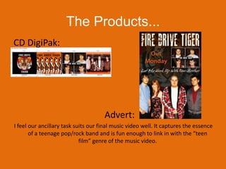 Katherine evaluates her ancillary task of designing a CD cover and inserts for the fictional band Fire Drive Tiger. She summarizes the design process for each element, including using inspiration from real band covers and layouts. Key design elements included a cartoon tiger face, orange and black colors, and matching fonts. Katherine believes the final ancillary product captures the pop/rock genre, appeals to their target audience, and complements their music video well through consistent use of the tiger icon and colors across all pieces.
