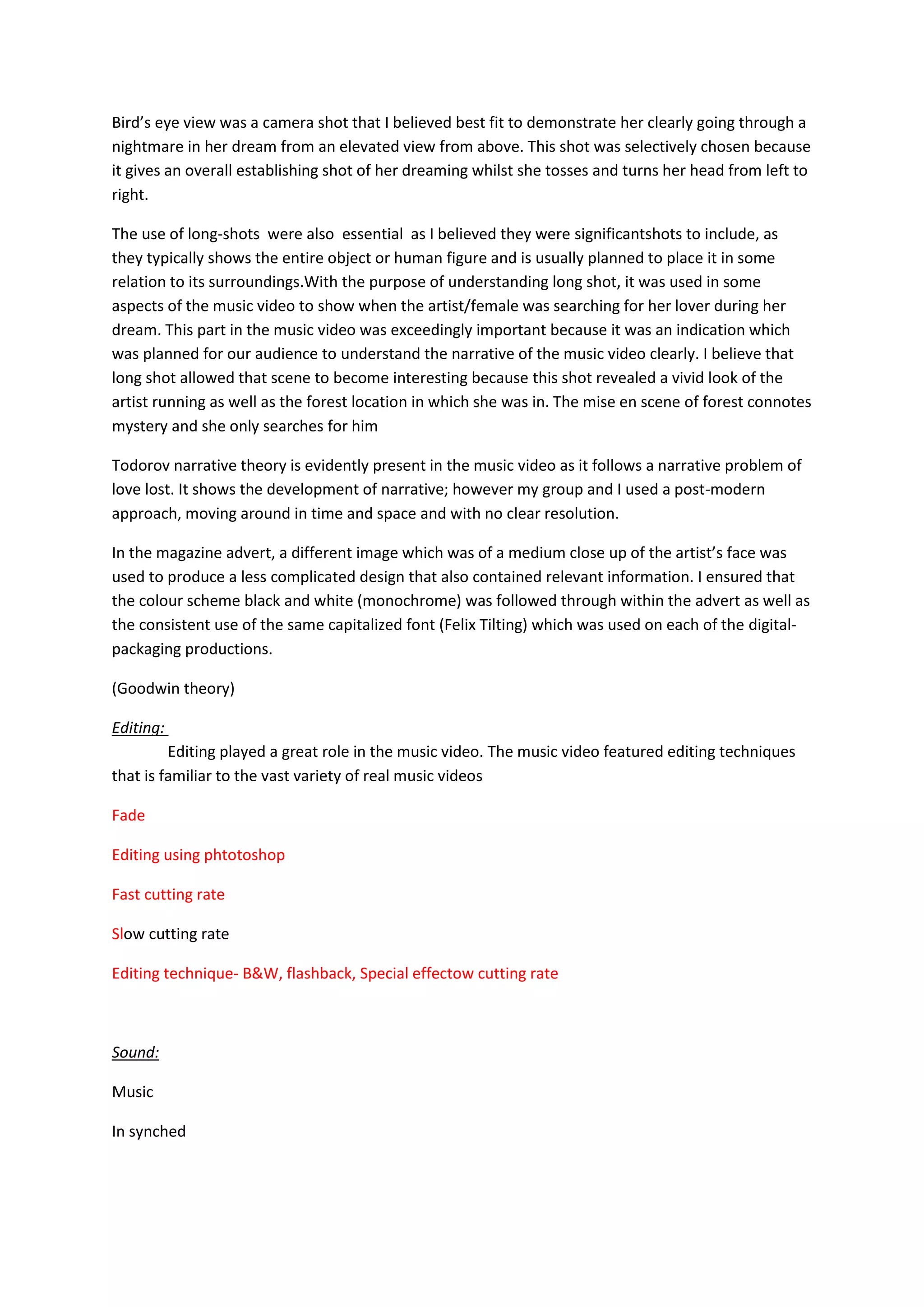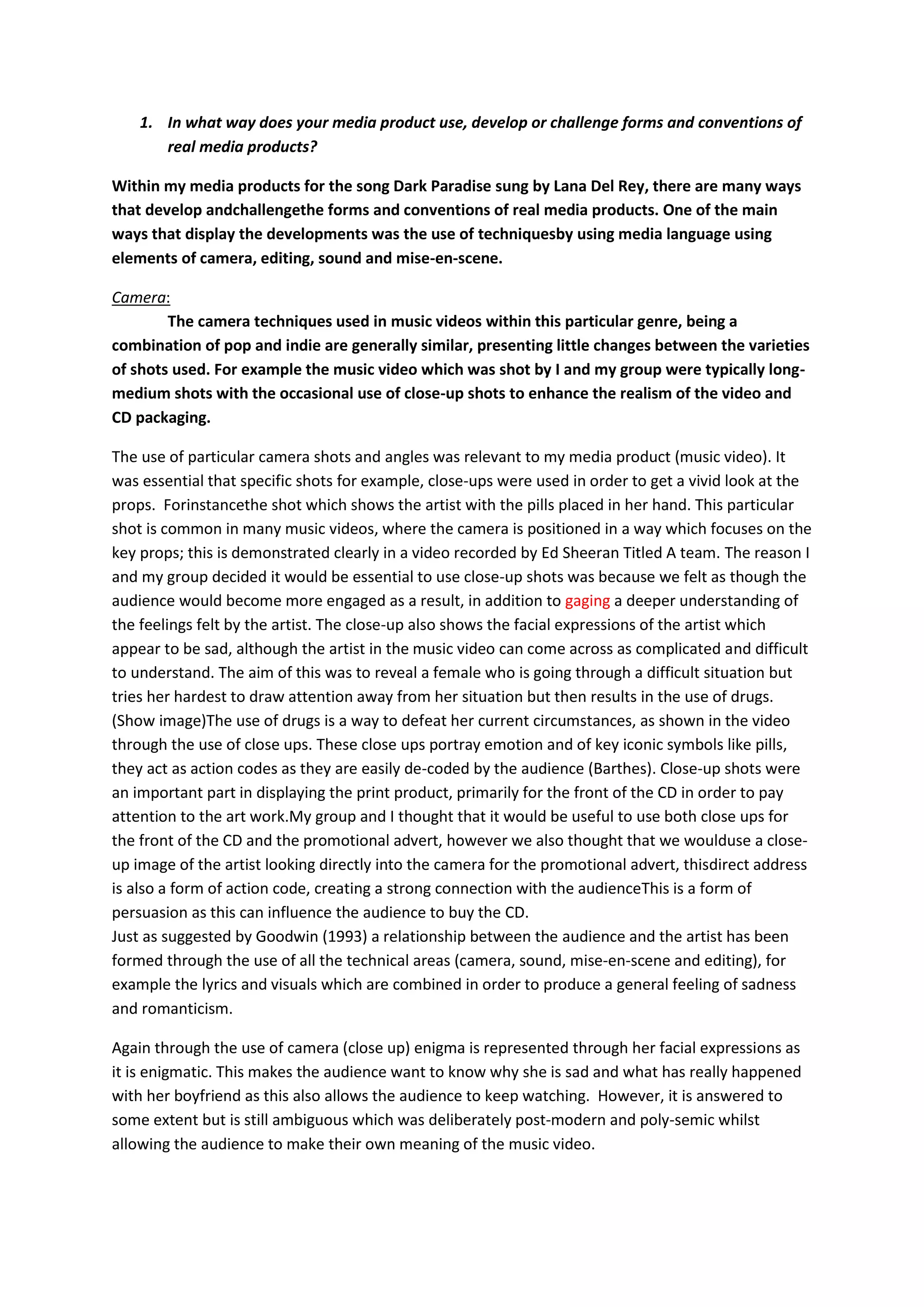 The document summarizes how the media product uses and challenges conventions of real media through techniques like camera shots, editing, sound, and mise-en-scene. It discusses using close-up shots of the artist and props to engage audiences and convey emotions. Feedback was gathered from audiences to understand how to improve the video and print products. A variety of media technologies were used in the research, planning, and evaluation stages.