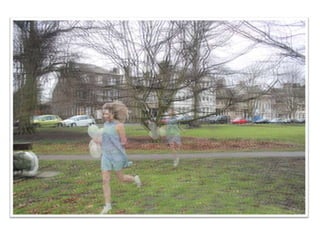 The document summarizes a photography shoot where the photographer experimented with different techniques, including multiple exposures and out of focus shots. Weather conditions made the shoot difficult and the photographer had to make adjustments on the fly. Edited photos applying different effects in Photoshop are included, such as overlaying shots and changing layers to black and white. The photographer aims to convey emotions like loneliness and discovery through surreal, overlapping images.