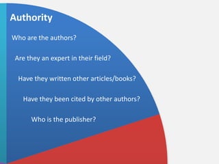 This document provides guidance for evaluating information sources based on their authority, currency, content, accuracy, and potential bias. It advises assessing the expertise and reputation of authors, when the information was published, whether the content is relevant and comprehensive for the topic, if the facts can be verified or corroborated by other experts, and if the author or publisher has a vested interest that could introduce bias. In 3 sentences or less, it outlines key criteria for evaluating the reliability and trustworthiness of an information source.