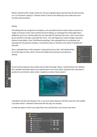 1) The document discusses the process of creating a music video for a class project, including pre-production research, filming, and editing.