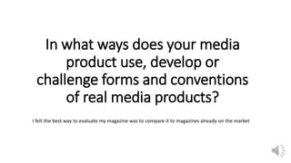 The document summarizes how the author's media product uses, develops, and challenges conventions of real media products.