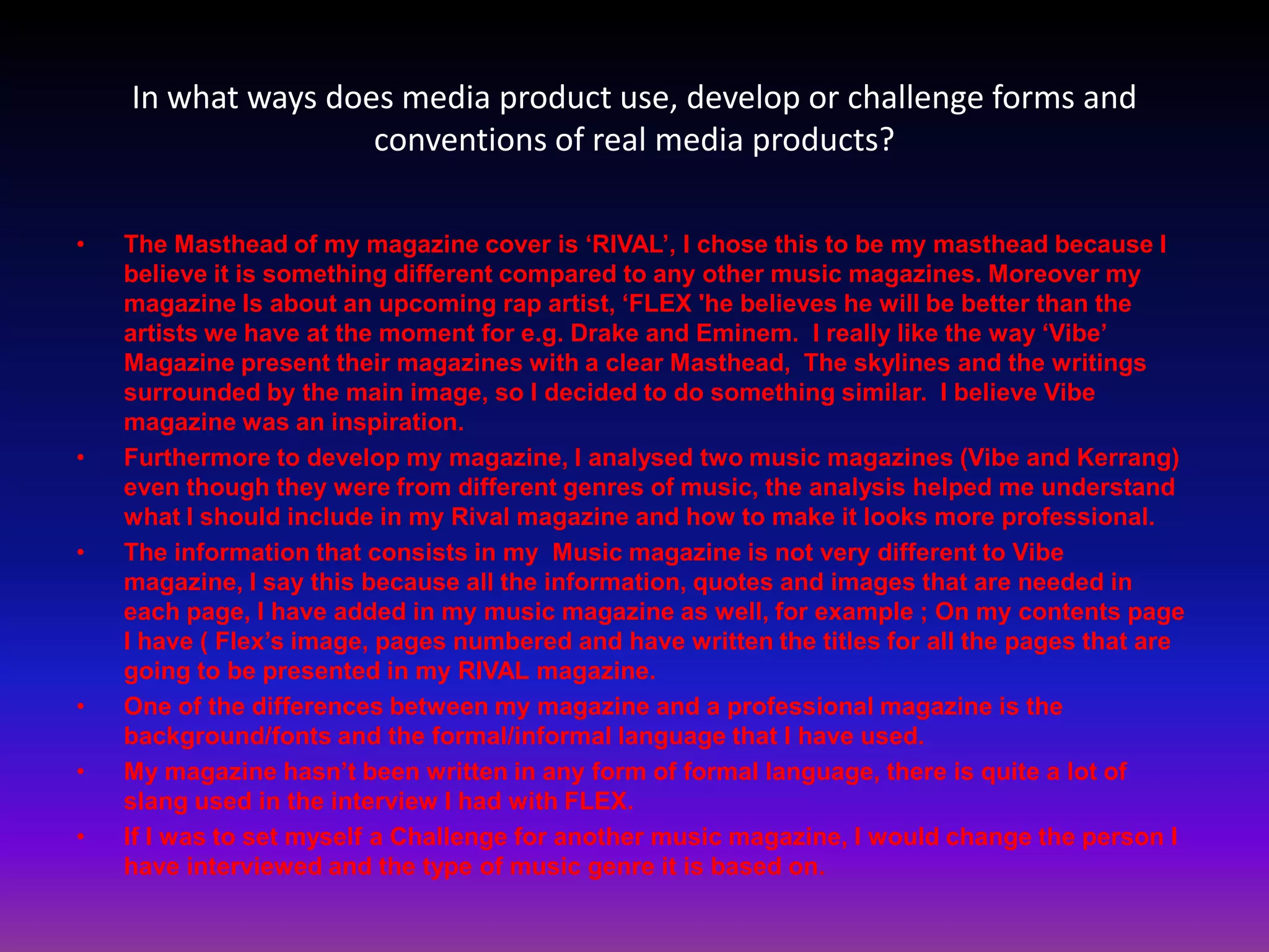The student analyzed real music magazines like VIBE to help develop their magazine's format and style. They included information, images, and quotes like a professional magazine but used informal language and slang more suitable for their target audience of 16-30 year olds.