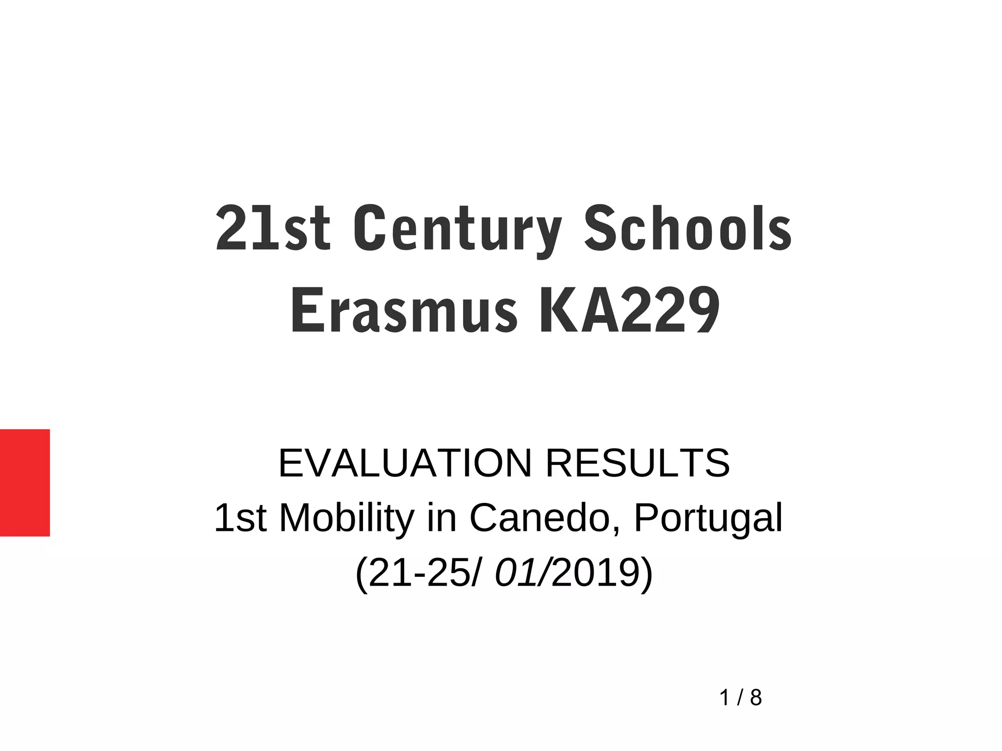 The document outlines the evaluation results of the 1st mobility event in Canedo, Portugal, held from January 21-25, 2019, as part of the 21st Century Schools Erasmus KA229 project. It includes various activities such as presentations, workshops, and visits that aimed to enhance educational strategies and collaborative learning among participating schools. Feedback and suggestions for future mobilities were also gathered from participants.