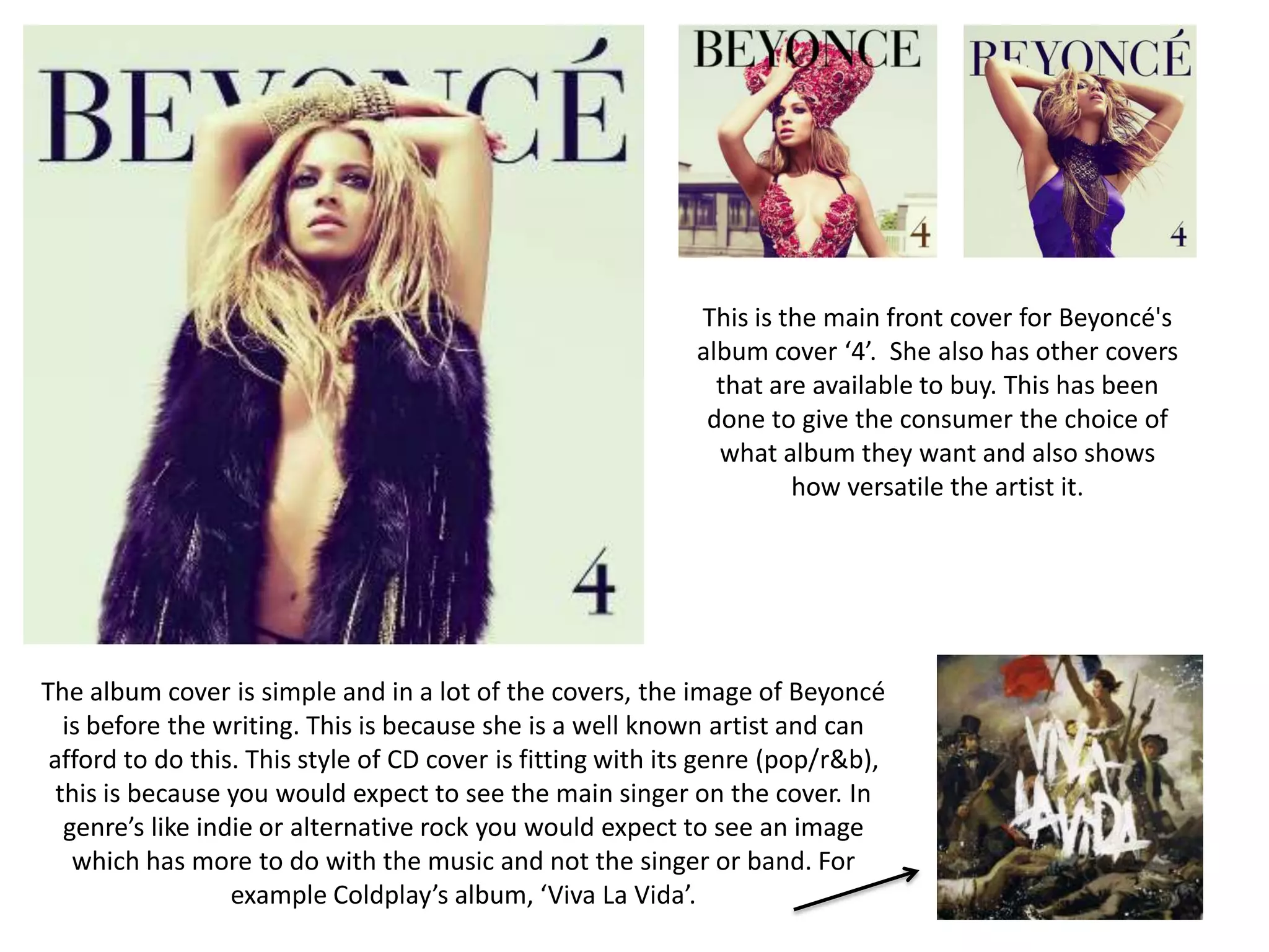 This document discusses how Beyoncé and other artists connect their album covers and music videos through consistent style elements like costumes, makeup, poses and themes. It notes how Beyoncé's heavy makeup, fur, jewelry and poses are mirrored in both her album cover and music video for "Run the World" to maintain continuity. The document advocates keeping similar stylistic connections between album art, music videos and other promotional materials to clearly portray the intended character and message to viewers.