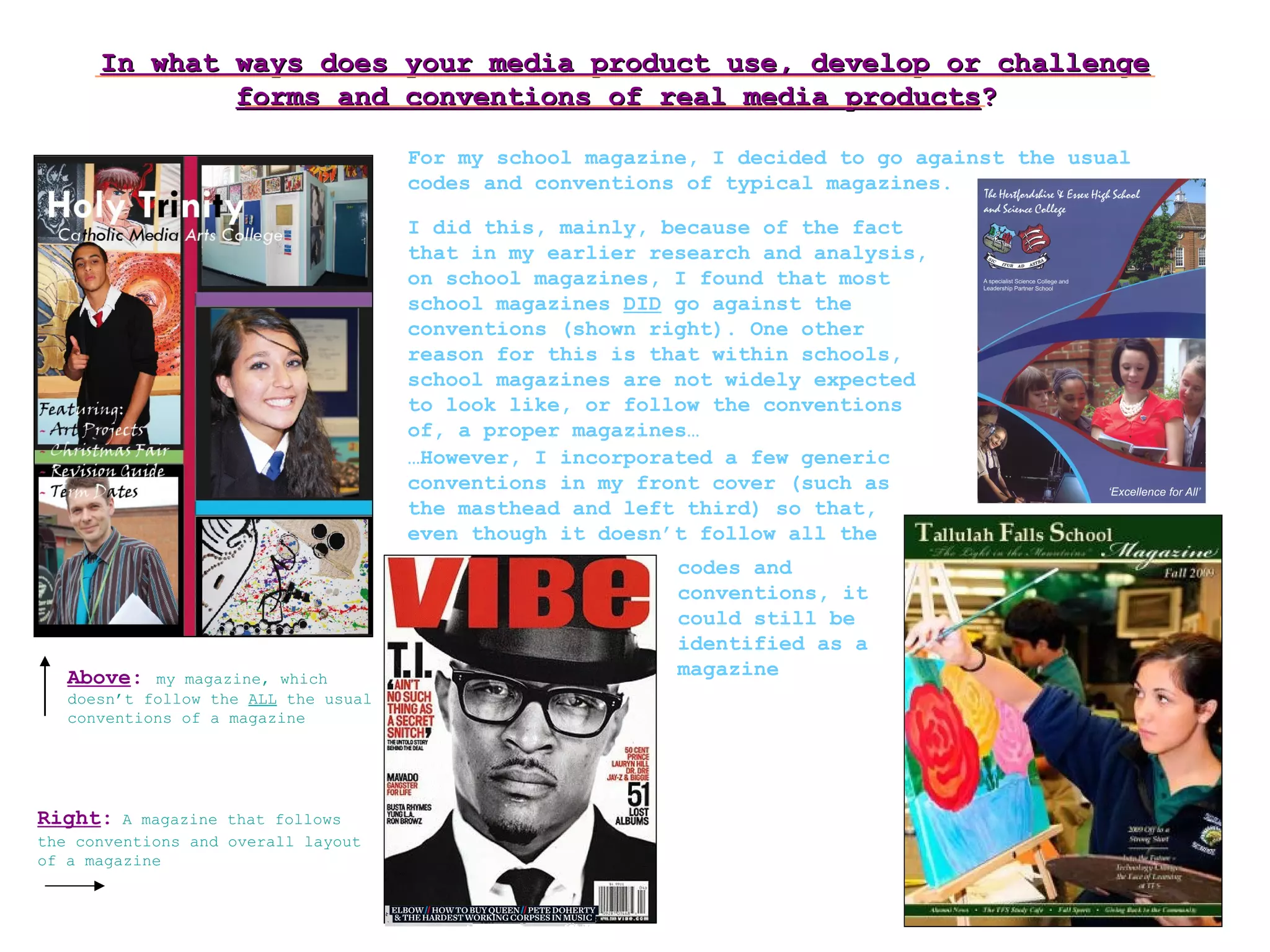 The document discusses a student's school magazine project. For the magazine, the student decided not to follow typical magazine conventions since research found most school magazines also diverged from conventions. The intended audience was students, based on survey feedback. The front cover and contents page use images and colors appealing to younger audiences. Distribution would likely be by students or school governors to increase their involvement. Through creating the magazine, the student learned about transferring assets between Photoshop and InDesign for layout, and gained experience using a Nikon camera.