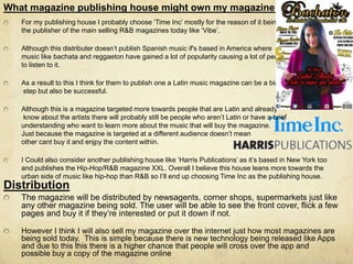 The document discusses distribution options for a proposed Latin music magazine. It considers distributing through newsagents, shops, and online like most magazines. The author proposes publishing with Time Inc., which publishes popular R&B magazines like Vibe, as they could benefit from expanding into Latin music. The magazine would be distributed monthly to provide enough new content each issue, and a subscription option would allow online access for readers with smartphones. However, the author notes many magazines are experiencing lower sales as technology enables getting free, illegal copies online.