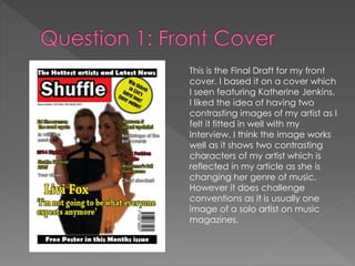 This document summarizes the creator's process for designing the front cover of a music magazine. It describes using two contrasting images of the featured artist to reflect the changing genre discussed in the interview article. While unusual to feature two solo artist images, the designer felt it fit well. Inspiration was drawn from magazine covers of Katherine Jenkins and Billboard but adapted to include additional elements. The final cover was deemed conventional in layout and colors while still challenging conventions slightly with the dual artist images.
