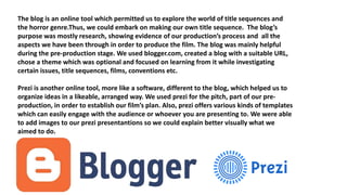 The document discusses technologies used during the pre-production, production, and post-production stages of creating a title sequence for a film project. During pre-production, a blog and Prezi were used for research and organizing ideas. A video camera was used to film footage during production, and the students learned how to operate it. A studio provided lighting and atmosphere for some scenes. Finally, Final Cut Pro was used to edit the footage, add sound effects, and finalize the title sequence.