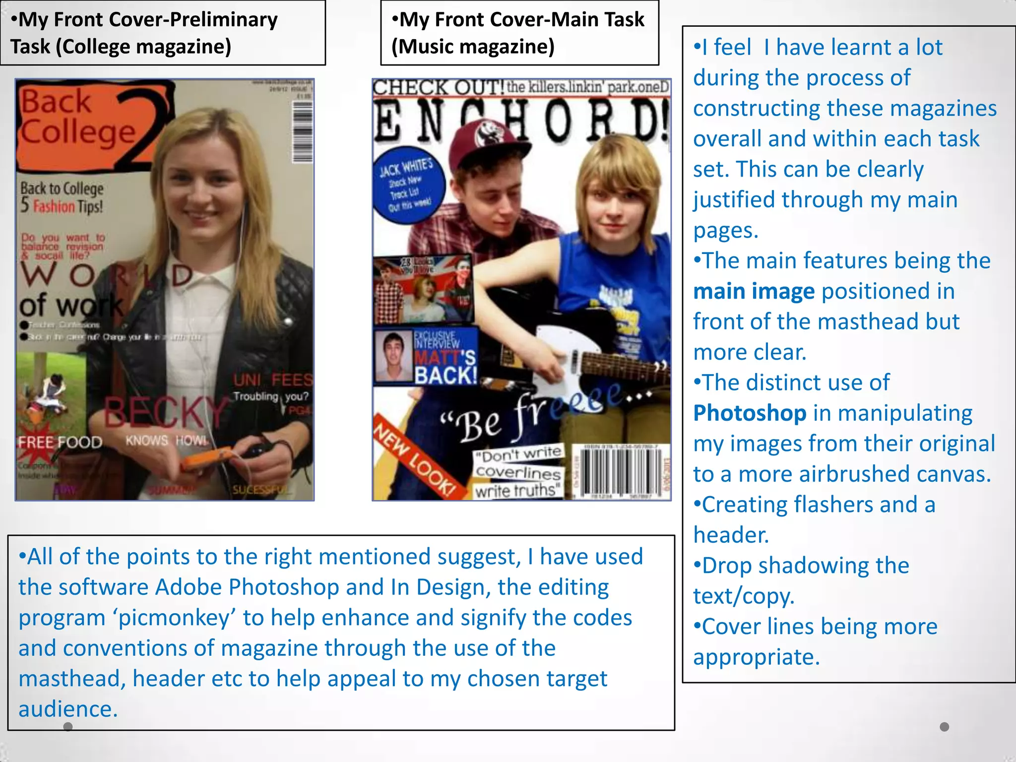 Poonam Parmar reflects on how their skills and knowledge have developed from their preliminary magazine front cover task to their full music magazine product. They learned to better utilize layout, composition, typography, white space, and consistent themes to make the magazine more realistic and appealing to their target audience. Specifically, they improved at using the rule of thirds, manipulating images, creating flashers and headers, drop shadowing text, and choosing more appropriate cover lines. They also felt creating a double page spread was a new challenge that they overcame.