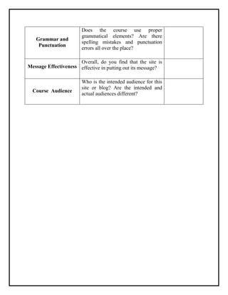 This document provides a rubric to evaluate online courses with criteria in several areas: design, focus, content, writing style, grammar and punctuation, message effectiveness, and intended audience. The rubric asks evaluators to comment on each area and assign a rating from 1 to 5. Key areas of evaluation include how pleasing and easy to navigate the design is, how clear the focus of the course is, how well the content matches the focus, the writing style and voice used, any grammar or spelling errors, how effective the message is, and whether the intended and actual audiences align.