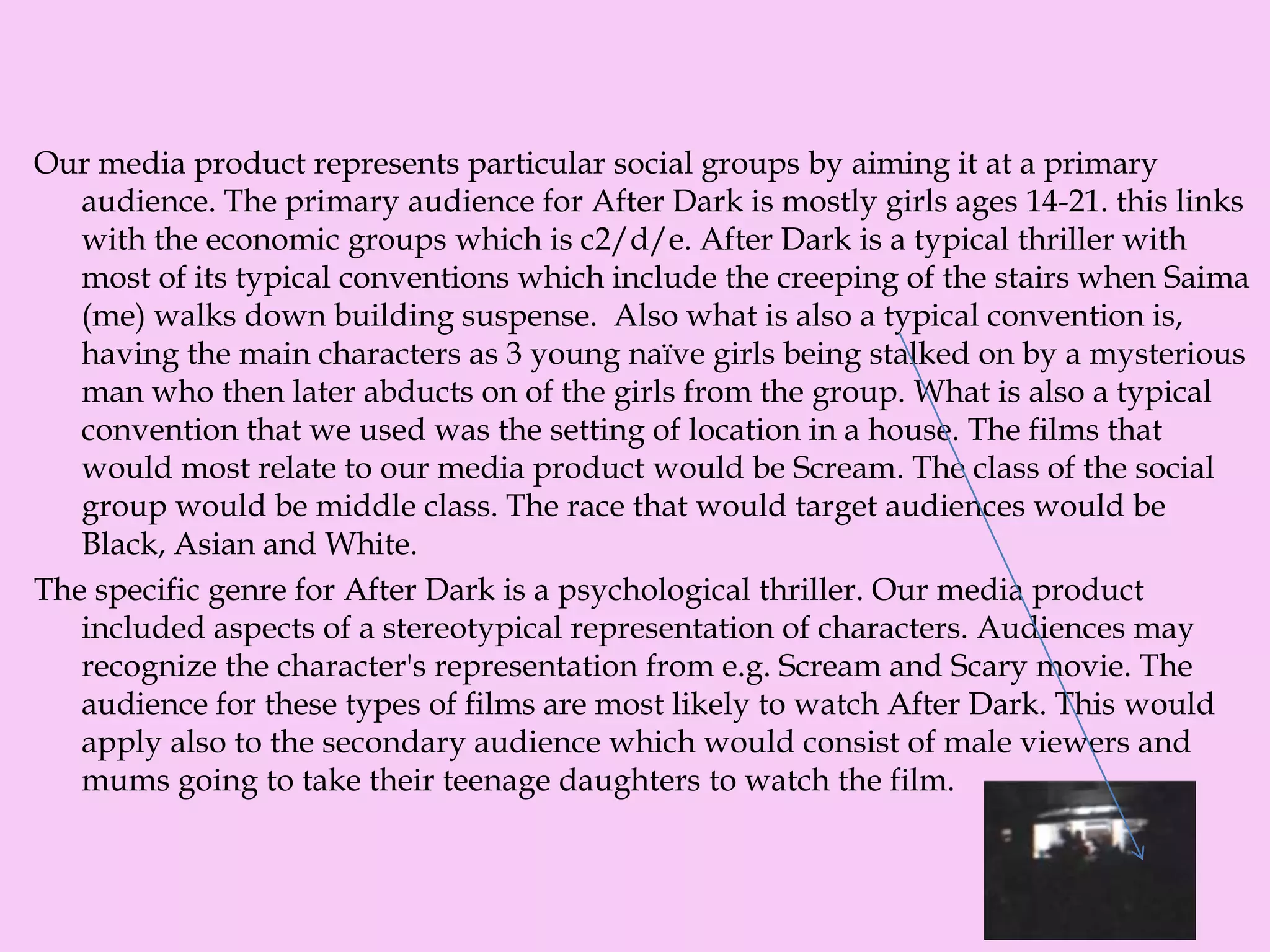 Our media product represents teenage girls ages 14-21 from middle-class backgrounds. It uses conventions of the thriller genre like creeping music during suspenseful scenes. The film follows three girls being stalked by a mysterious man who abducts one of them. Dimension Films and The Weinstein Company would be suitable distributors as they distribute similar thrillers. We attracted our target audience through establishing genre conventions seen in films like Scream, though feedback noted we needed more conventions and less conversation in the opening.