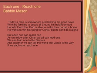 1) The document discusses evangelism and encourages each person to reach one other person with the message of Jesus. It references a song about each person proclaiming the gospel in their neighborhood.