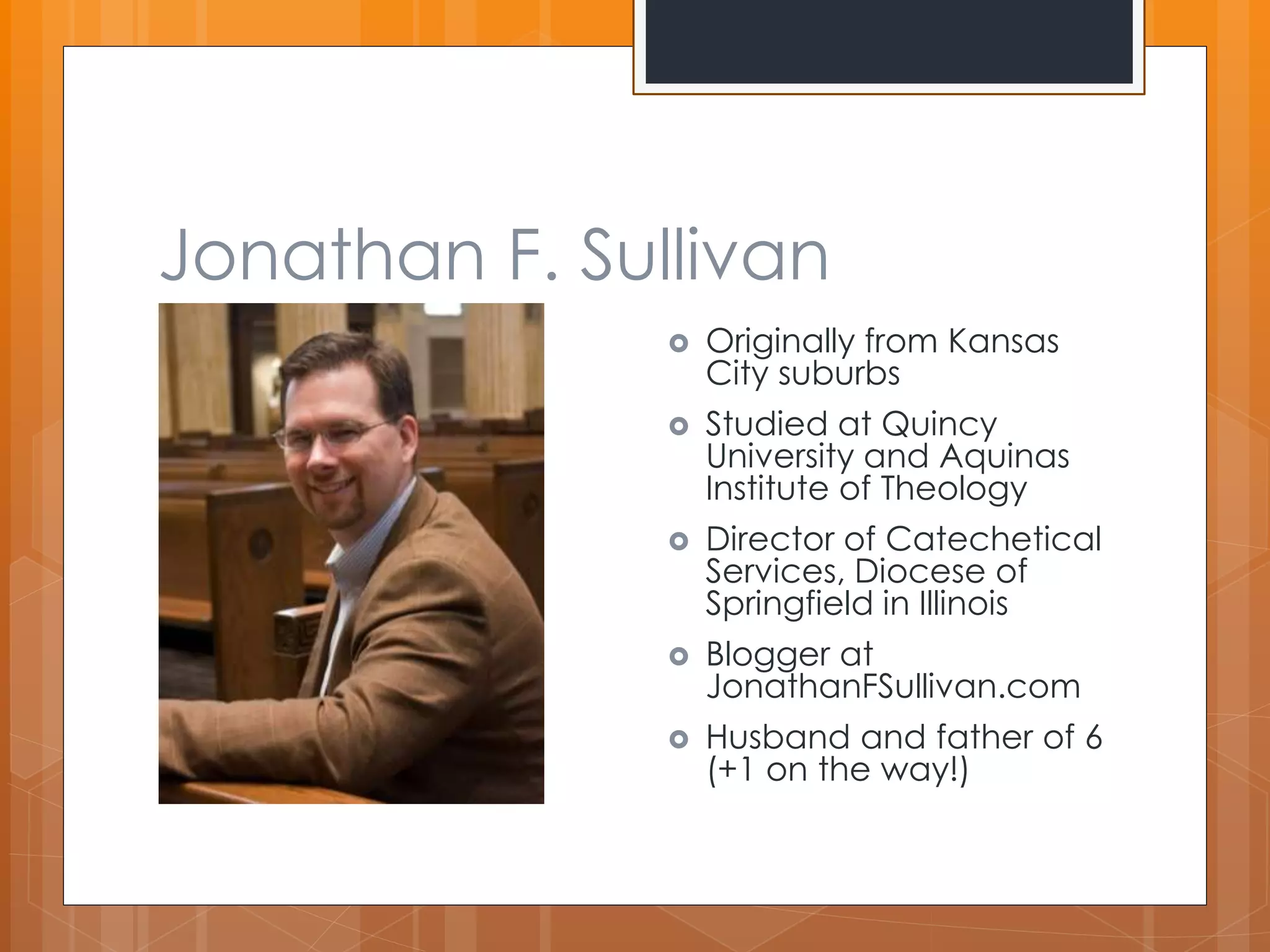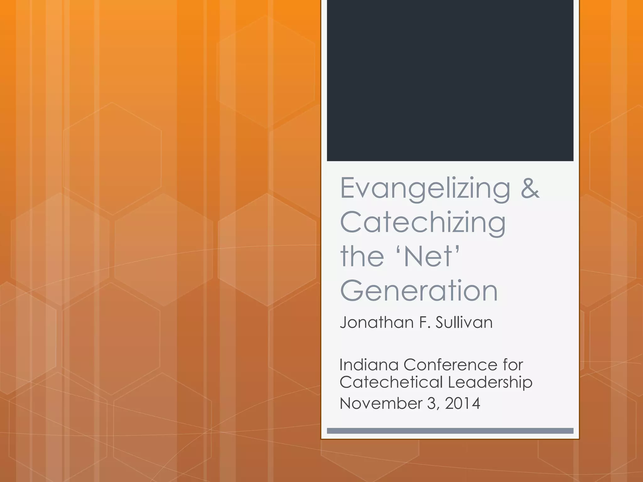 This document outlines Jonathan Sullivan's presentation on evangelizing and catechizing the "Net Generation". It discusses who the Net Generation is, common myths about them, their learning styles with technology, and strategies for engaging them online. Some strategies suggested include using popular tools, connecting with them, being open, encouraging appropriate sharing, following policy, curating resources, integrating mobile tech, showing videos, making videos, and praying with new media. The goal is reaching youth online while maintaining internet safety and protecting privacy.