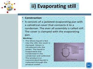 The document outlines a presentation on evaporation given by Malaika Jabeen and Maryam Akhtar for their Separation Tech course. The presentation covers the purpose of evaporation, its mechanism, factors that affect it, evaporation under reduced pressure, differences from distillation, equipment used, applications, and pros and cons. It provides an overview of the key topics and concepts to be discussed in their presentation on evaporation.