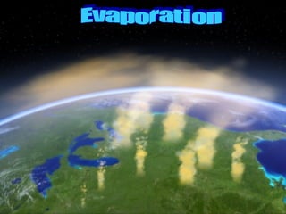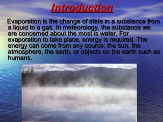 Evaporation is the process where a liquid turns into a gas, specifically water turning into water vapor. Several factors influence evaporation, including wind speed, temperature, and humidity, with higher wind speeds, temperatures, and lower humidity leading to more evaporation. As water evaporates from surfaces like rivers and lakes, it enters the atmosphere as water vapor and can form clouds. This process of evaporation causes cooling effects as the evaporating particles absorb heat from their surroundings.