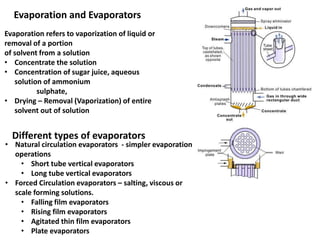 This document provides information about different types of evaporators used to concentrate solutions. It discusses natural circulation, forced circulation, falling film, rising film, and plate evaporators. It covers key aspects like heat transfer, material and energy balances, capacity, economy, fouling, and multiple effect evaporation. The main types discussed are horizontal tube, short tube vertical, basket, long tube vertical, forced circulation, falling film, rising film, agitated thin film, and plate evaporators.
