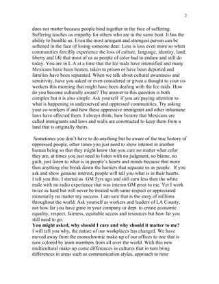 The document discusses creating a culturally aware and diverse workplace. It emphasizes the importance of cultural awareness training to help multicultural workplaces identify differences and problems. Employees should get to know their coworkers as individuals, set aside assumptions, and avoid blaming others. Building understanding between people of different backgrounds requires open-mindedness, appreciation of differences, and a shared recognition of our common humanity.